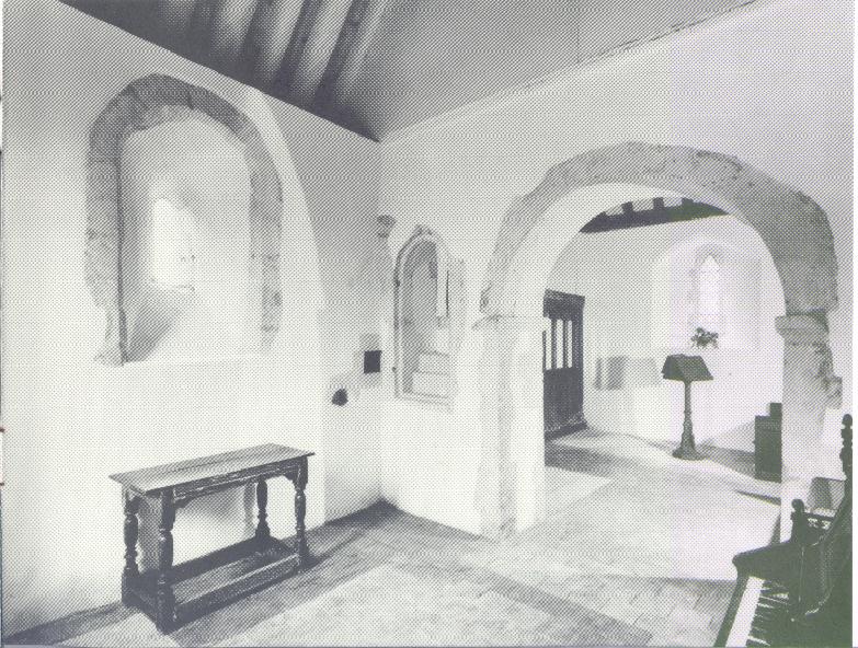 The diagram below shows the layout of the existing building, which consists of a nave and chancel (some 60 feet by 15 feet), with a north transept, south porch and west bell turret. The Norman building was cruciform and in the late 14th century the arches of the central crossing, with the exception of the arch to the north transept, were removed. This opened up the nave to the chancel, which was partitioned off by an oak screen, of which only the original main uprights still survive. In 1874 new tracery was provided at the sides to match a fragment of the original which had remained.